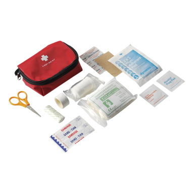 First aid kit: 1 pair of scissors, 5 plasters (40 x 10mm), 1 flexible piece of fabric tape, 2 plasters (70 x 18mm), 1 providone-iodene prep pad, 1 alcohol prep pad, 1 wrapped gauze, 1 roll of tape PBT, 1 roll of gauze, 1 roll of fabric tape, 1 sling with