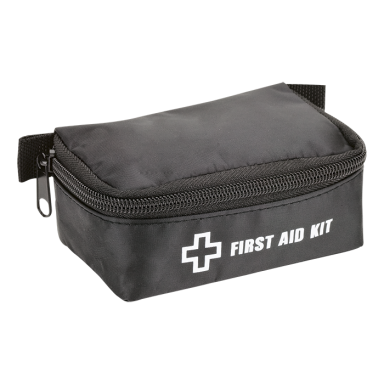 First Aid kit: Scissors, 5 adhesive bandages, gauze roll, gloves, tape roll, 5 safety pins, flex adhesive bandage, 3 alcohol pads, triangular arm sling, wound pad